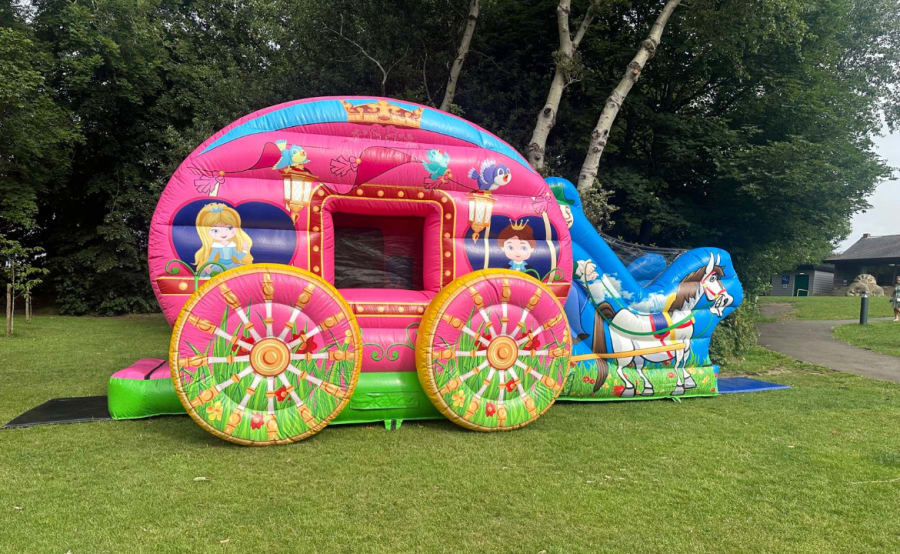 Our Princess Carriage Combi Castle is ideal for bouncy castle hire and inflatable hire in Newcastle, Gateshead, and Northumberland. 🚚 Let your little ones bounce, slide, and play in royal style with this spectacular inflatable attraction. 👑🎈