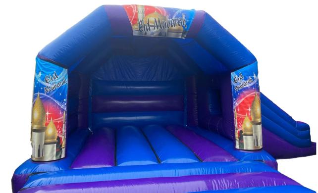 Create unforgettable memories this Eid with our stunning 18ft by 15ft Eid Mubarak Combi Castle. Designed to captivate and entertain, this bouncy castle is an essential addition to your Eid festivities. Its vibrant blue and purple colour scheme is sure to complement your celebration, offering a delightful visual treat for all your guests.