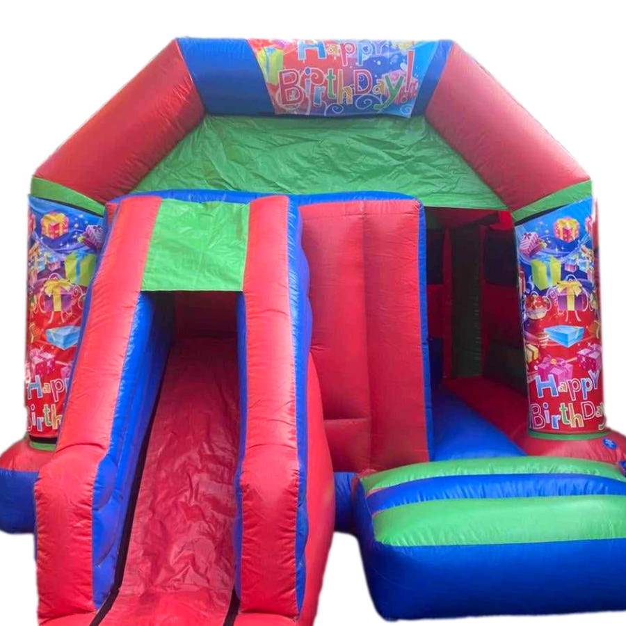 Transform any celebration into a memorable event with our Happy Birthday Themed Colourful Combi Castle. This 12ft by 18ft inflatable masterpiece is more than just a bouncy castle; it's a complete entertainment hub designed to captivate and delight children of all ages. Whether you're hosting a birthday party, a family reunion, or a community event, our combi castle is the perfect addition to create joy and laughter.