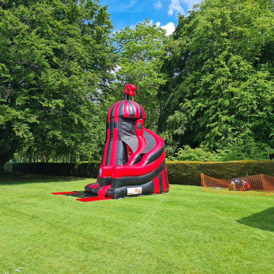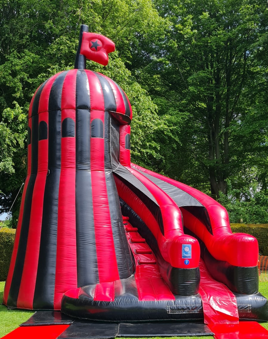 Looking to make your event truly unforgettable? Our 24ft Helter Skelter Slide is the perfect centerpiece to captivate and entertain guests of all ages. At a towering 7 meters high, this striking black and red striped slide is guaranteed to stand out and become a must-visit attraction at any gathering.
