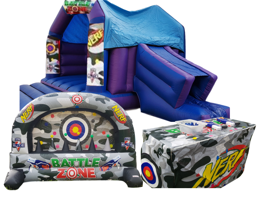 - Nerf Themed Side-Slide Bouncy Castle: Dive into the action with our vibrant and exciting bouncy castle, designed with a Nerf theme to immerse you in the battle atmosphere. Perfect for kids and adults alike, it's a fantastic way to burn off energy while having a blast! 🎈